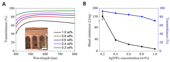 (A) Optical transmittance of AgNW-PEG layer on PET films prepared using various concentrations of dispersed AgNWs in the precursor solutions. (A inset) Photograph of highly transparent AgNW-PEG line patterns of line width 1 mm on PET film (AgNW concentration: 0.6 wt %). (B) Sheet resistance and transmittance at 550 nm of AgNW-PEG on PET film, versus AgNW concentration of the precursor used.