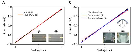 (A) Current–voltage (I–V) characteristics of AgNW-PEG line patterns (i) on glass before the direct transfer process, and (ii) on PET substrate after direct transfer (0.6 wt % AgNW concentration). (B) I–V curves of AgNW-PEG line patterns on PET during a bending test (0.6 wt % AgNW concentration; 1 cm bending radius).