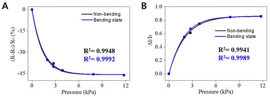 Responses of a sandwich-type pressure-responsive sensor device of elastic AgNW-PEG composite hydrogel patterns on flexible PET (1 mm line pattern width). (A) Relative resistance change (RCR), and (B) relative current change (RCC) of the sensor with bending or non-bending state under various pressures (1.96, 2.75, 3.92, 7.85, and 11.77 kPa, 1.5 cm bending radius).