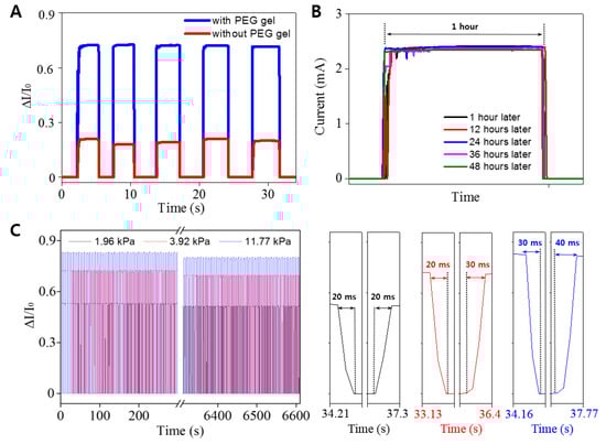 The electromechanical sensors typically exhibit drift phenomena that are less accurate and less sensitive when exposed to steady stimuli. Therefore, we investigated the current difference of AgNW-PEG based pressure sensor under 3.92 kPa for 48 h as shown in Figure 6B. As a result, the initial current value was decreased to only 1.8%, indicating the good stability of AgNW-PEG based pressure sensor. Other important requirements for high-performance pressure sensors are excellent cyclability and fast response time. Our pressure sensor produced stable and reproducible signals with very fast response and relaxation times (20–40 ms) over 1000 cycles of pressure loading/unloading (1.96, 3.92, and 11.77 kPa) (Figure 6C). These results likely arose from the stable electrical contact and excellent elastic deformation of the AgNW-PEG composite hydrogel under static loading.