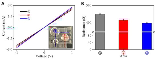 (A) The I–V curve and (B) resistance of a sandwich-type pressure-sensor device for demonstrating the functionality of the sensor array. (A inset) Photograph of sensor array with AgNW-PEG line patterns (width: 1 mm) on PET substrate under several weight pressures (① 2 g; ② 5 g; ③ 10 g).