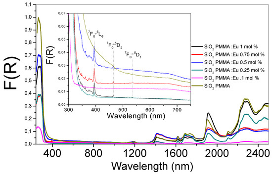 In Figure 1, the absorption spectra of the six SiO2-PMMA samples under investigation are presented. The wavelengths varied in the 240–2500 nm range. In the inset image of Figure 1, an enlargement of the wavelength region between 300 and 750 nm is presented. It can be observed that the absorption edge for all the samples was approximately 350 nm. All the samples presented the same bands with different amplitudes. In the inset image, due to the Eu3+ ion presence, three bands were identified that were associated with the electronic transitions 7F0→5L6 (392 nm), 7F0→5D2 (460 nm), and 7F0→5D1 (538 nm). The first band represented the most intense absorption and was observable for all the doped samples. It appeared due to the direct excitation into the 4f6 levels of the Eu3+ ions [11]. The band associated with 7F0→5D2 was an electric dipole transition and was used to determine the position of the 5D2 level; it was observable for dopant concentrations higher than 0.1 mol %. The magnetic dipole transition (7F0→5D1) presented small intensities and was observed only for the samples doped at 0.75 and 1 mol %.