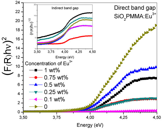 (F(R)hν)n vs photon energy (Tauc plot) in the absorption edge range for the SiO2-PMMA:Eu3+ samples. In the inset, the (F(R)hν)1/2 vs photon energy relation is plotted for n = 0.5, while in the main graph n = 2.