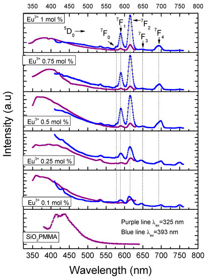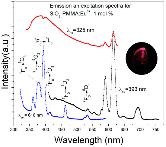 Figure 3 presents the emission spectra using 325 and 393 nm as excitation wavelengths and the excitation spectrum detected at 616 nm of a SiO2-PMMA:Eu3+ sample with 1 mol % Eu3+. The excitation wavelength of 325 nm was used to observe the complete emission band due to the SiO2-PMMA matrix, which is in the range of 340–500 nm. In contrast, the excitation wavelength of 393 nm was used to excite the Eu3+ ions and to induce photoluminescence due to the direct population of the 4f levels. In the same figure, the excitation spectrum recorded at 616 nm displays a set of bands associated with the 4f electronic transitions: 7F0→5G3 (377 nm), 7F0→5G2 (380 nm), 7F0→5L6 (392 nm), 7F0→5D3 (413 nm), 7F0→5D2 (462 nm), and 7F0→5D1 (530nm) [11,14]. Because the emission spectrum of the SiO2-PMMA matrix (340−500 nm) presents a decrement at around 392 nm and the excitation spectrum at 616 nm has the most intense band associated with the electronic transition 7F0→5L6 (392 nm) in the same wavelength position, it can be argued that the decrement is caused by the radiative energy transfer from the matrix to the Eu3+.