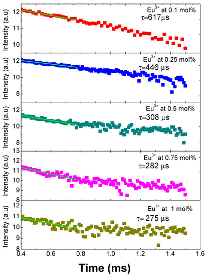 The decay time curves for all the doped samples first were fitted to a single exponential function with the following expression I = I0 exp(−t/τ), which indicates that the Eu3+ ions are located in similar sites suffering the same crystal field [4]. Subsequently, applying the natural logarithm function to these results, we obtain what is presented graphically in Figure 6, where it can be observed that the 5D0 lifetime shortens with the increase of the concentration of the Eu3+ ions due to the cross-relaxation process among Eu3+ ions. The lifetimes obtained are 275 ± 10 µs (1 mol %), 285 ± 6 µs (0.75 mol %), 308 ± 5 µs (0.5 mol %), 446 ± 20 µs (0.25 mol %), and 617 ± 30 µs (0.1 mol %). The cross-relaxation process leads to fluorescence quenching (i.e., to the decrease of fluorescence intensity when the rare earth concentration is increased). One has to consider, in fact, that, with the increasing concentration of rare earth ions, the ion spacing decreases and may be small enough to allow them to interact and transfer energy [18].