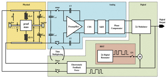 Thus, the EM-ΣΔ closed-loop accelerometer is the most advanced technique for building an interface circuit for accelerometers. However, the aforementioned methods either treat the sensing element as an individual device or treat the whole system as a black box. The BIST method, which is dedicated for this type of system, is rarely reported.