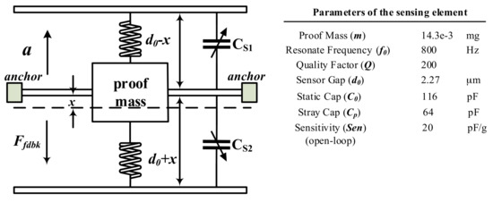 where m is the proof mass, b is the damping factor, k is the spring constant, is the resonate frequency, is the quality factor. In closed-loop configuration, the response of the system is a comprehensive result of sensing element and interface circuit, and thus, the above parameters no longer dominate the system bandwidth, sensitivity, and resonance characteristic, therefore, more latitude can be obtained in choosing the mechanical parameters.