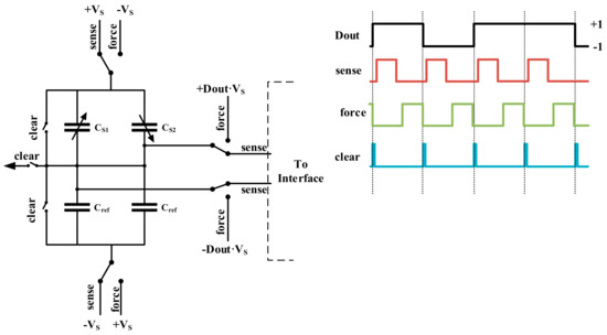 One way to solve this problem is getting the linear result by subtracting a pair of balanced preload forces which are differentially changed on both sides, and realizing the frequency domain separation by modulating the measurand to high frequency [35,36,37]. However, there are interactions between sensing and force feedback mode, and if the preload force is above a certain limit, its polarity will reverse, resulting in instability [33,37]. Thus, in our system, we resort to oversampled ΣΔ force feedback to realize the linearization, and time-multiplexing technique to realize the separation of sensing and force feedback mode in the time domain. The applying mechanism of ΣΔ time-multiplexed feedback force is shown in Figure 3.