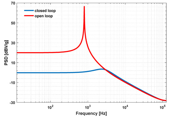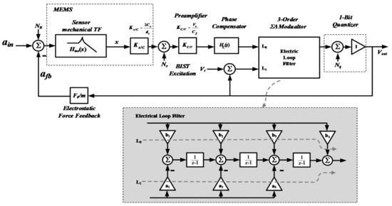 Open-loop is a simple and cost-effective implementation which has been adopted in early designs. However, several drawbacks have been identified: since it is necessary to provide sufficient damping, more Brownian noise is introduced. Furthermore, the design latitude is constrained by the contradictory trade-offs introduced by the sensing element [12,29]. Since each element in the signal chain will add a distortion in final performance, the linearity of it is, thus, relatively poor.