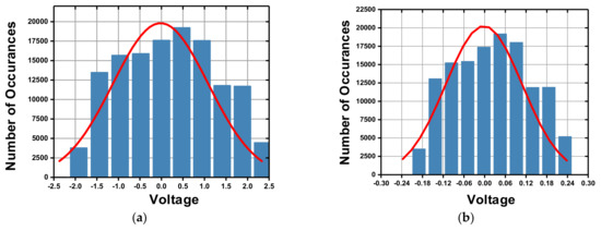 As evident, the 3-order integrating effect, which is the major force in gain enhancement, is missing in this expression. As a result, the loop gain seen by residue displacement is much less than that seen by quantization noise. In order to make up for this loss, an additional gain stage is needed. However, if it is inserted in the feed-forward path, there will be more energy appearing in front of the quantizer, which will result in an earlier saturation. An alternative way is to scale the coefficient in the feedback path L1, which can easily be realized by scaling the feedback voltage. As shown in Equation (11), the decrease of L1 will give rise to STF3-order. The distribution plot of the input voltage in front of quantizer is shown in Figure 6. As shown, the scaling of L1 will also help in reducing the signal amplitude in the feed-forward path, which will make the behavior of the electrical circuit more ideal. However, we must admit that the decreasing of L1 will cause a reduction in the quantization noise suppressing ability due to the reduced loop gain. Besides that, there will need more continuous logic levels to draw the input back, which means more susceptible to instability. In our system, L1 is scaled as one-tenth of L0, to make a compromise to those trade-offs.