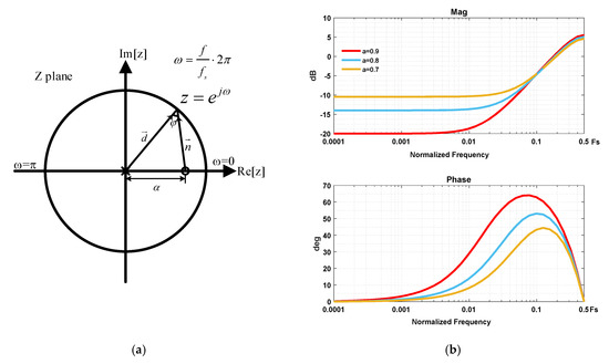 where α is a compensation factor whose value is in the range of (0, 1). The distribution plot of poles and zeros is shown in Figure 7a. The frequency response of HC(z) can be found by graphically considering the magnitude and phase of vectors connecting its poles and zeros to point around the unit circle. As evident, the magnitude is minimum at dc, and starts increasing until the frequency reaches 0.5fS, resulting a limited variation from 1 − α to 1 + α. Also, there is a positive phase angle φ varying with frequency, which starts from zero at dc, and reaches its maximum when vector is perpendicular to the real axis, and falls to zero again when the frequency reaches 0.5fS. Thus, the name phase compensator [9] is derived from the fact that the gain variation is limited and concentrated around dc, but there is a positive phase lead which will exert its influence at crucial frequencies. The bode plot of phase compensator is shown in Figure 7b.