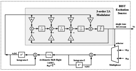 The BIST excitation source in our design is implemented using the ΣΔ resonating circuitry proposed in [49], and its block diagram is shown in Figure 9. The resonator incorporates a ΣΔ modulator in the feedback loop, resulting in concise architecture with an inherent 1-bit ΣΔ modulated output and no need for an area-consuming multibit multiplier. In order to enhance the signal to noise & distortion ratio (SNDR) performance to meet the BIST requirement, the ΣΔ modulator is implemented using 3-order cascode of integrators feedback (CIFB) architecture. The STF of it is set to 1 in order to minimize the introduced phase delay and simplify the selection of loop coefficient a12 and a21.