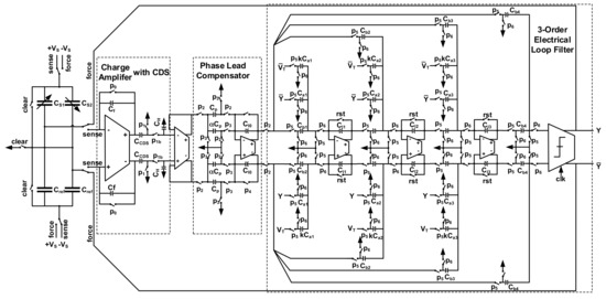 In the first stage, the capacitance change is converted to voltage by a charge amplifier. It has adopted an output correlated double sampling (CDS) technique, thus, low frequency in-band noise and dc offset from front-end amplifier are greatly reduced. The phase lead compensator is implemented using a summing amplifier. By summing the charge corresponding to no-delay in-phase signal, and delayed out-of-phase signal together, the transfer function shown in Equation (17) can be realized. The 3-order electrical loop filter is implemented by also using an SC circuit. In order to prevent the system from locking into saturation state in practical condition, a reset signal is added to clear the integrating capacitors, if needed. The BIST circuitry is implemented with verilog code, and synthesized to layout with electronics design automation (EDA) tools, and thus, is not shown in this schematic. The stimulus VT generated by BIST circuitry is added into the loop through a replicated feedback path, and thus, the addition with system output is realized indirectly.