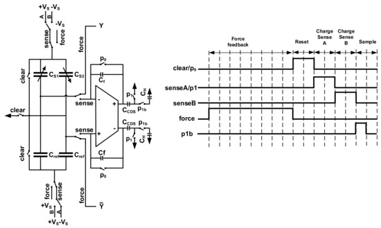 In order to remove the low frequency noise and offset in the front-end amplifier, the CDS technique is used. The circuit implementation and clock diagram are shown in Figure 11. At reset phase, each electrode of the sensing element is connected to the ground, in order to diminish the residue effect of previous feedback force. The charge on the feedback capacitor Cf is discharged too. Next, at phase A, the sensing element is charged by a pair of supply voltages, and the differential capacitance change is calculated by the SC circuit and stored on the capacitor CCDS. After that, in phase B, the polarity of the charge voltage of the sensing element is inverted, inducing a negative voltage change at the output of charge amplifier. Before that, CCDS is disconnected from the GND, leaving the node floating. Thus, after phase B, the output results perform a subtraction operation on the capacitor. Note that, the relative polarity of the low frequency noise and offset does not change, thus, they canceled each other out, due to the CDS operation. After that, the voltage at the floating node of CCDS is only related to the measurand, and is sampled on the hold capacitor CH at the next sampling phase.