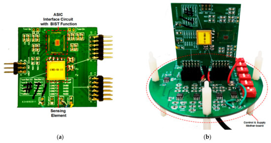 The photograph of prototype test board. (a) The daughter board with ASIC and sensing element; (b) The motherboard with the daughter board mounted.