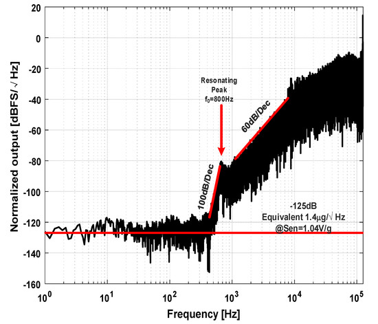 The output bit stream of the system and BIST stimulus are brought out through shielded wires and captured by a logic analyzer. The calculated PSD of the output noise spectrum at static 0 g condition is shown in Figure 15. The PSD is normalized to a full-scale voltage of 2.5 V. The noise floor of the system is about −125 dB, which is equivalent to an input acceleration noise of 1.4 μg/ (with a measured sensitivity of 1.04 V/g). From Figure 13, an evident resonating peak due to the underdamping characteristic of the sensing element can be found. Before that frequency, the spectrum shows a fifth-order noise-shaping characteristic, and after that frequency, the noise-shaping characteristic degrades to a three-order one, which is consistent with the aforementioned analysis.