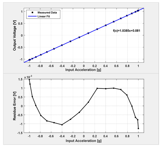 The static sensitivity and linearity of the system is identified by a series of static tests at different orientation in gravitational field. The prototype board is perpendicularly mounted on a dividing head, and the input gravitational acceleration can be calculated by the rotation angle readings. The static sensitivity and linearity test result is shown in Figure 16. As shown, the sensitivity of the closed-loop system is 1.04 V/g, and the static linearity is 0.708%.