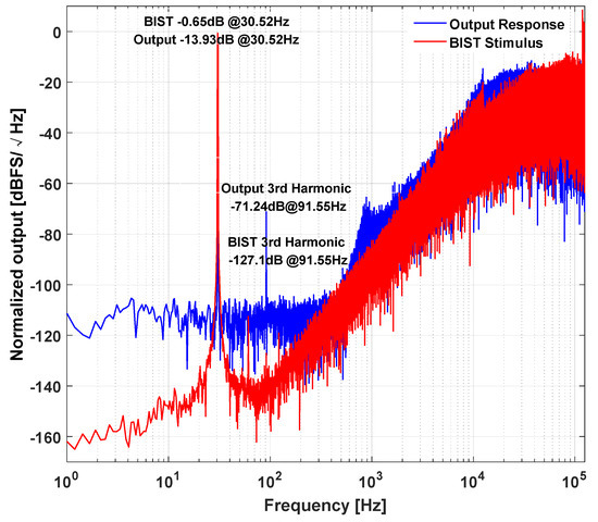 The harmonic distortion test is fulfilled by the on-chip BIST function. The sensing element is oriented at 0 g condition. A 1-bit ΣΔ modulated sinusoidal wave is generated by on-chip BIST resonator and injected into the loop to excite the proof mass to a constant oscillation. The amplitude and frequency of the BIST stimulus is set by the logic control signal generated on the mother board. Both the BIST stimulus and induced output bitstream is captured by a logic analyzer. Their calculated PSD is shown in Figure 17. It can be found that the noise and harmonic distortion of the BIST stimulus is well controlled by digital ΣΔ modulation technique. Furthermore, the noise floor of the output response in BIST test is slightly higher that of static test. This is due to the fact that the in-band quantization noise in the BIST stimulus is still injected into the loop, although most of it is suppressed by ΣΔ modulation. The third order harmonic of the BIST stimulus is −127 dB, while the third order harmonic measured in the output is −71 dB. This means that the loop gain is not sufficiently high, and the residue displacement does not get sufficient suppression, thus resulting in an obvious 3-order harmonic distortion. As shown in Equation (19), the loop gain of the closed feedback loop can be read by the ratio of BIST amplitude and output amplitude. By calculating the power of the signal bins, the amplitude ratio of BIST and output signal can be obtained, then, the loop gain is calculated as 13.95. As shown in Section 2.3, the feedback voltage of the 3-order electrical filter could give some latitude for gain enhancement.