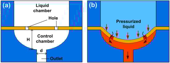 The structure schematic of the proposed passive valve concept is shown in Figure 1a. The valve comprises of a liquid chamber, an elastic membrane, and a control chamber. The liquid chamber connects to the valve inlet for liquid input. The control chamber has an ellipsoid surface, which connects to the valve outlet for liquid output. Two micro-sized holes were designed in the membrane for liquid to flow through, while the membrane would deform towards the control chamber under liquid pressure to regulate the outlet flow rate. As described in Figure 1b, when the inlet liquid pressure is increased to deflect the membrane, the volume of the control chamber decreases due to the membrane deformation, hence the flow resistance of the valve increases. The flow rate of the valve can be estimated as: