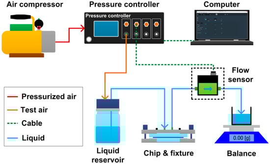 A set of flow measurement setup was used to measure the flow rate of the microfluidic passive valve under a set of target test pressures. As shown in Figure 5, an air compressor was used to supply compressed air (CDA) to a pressure controller (OB1 Base MkIII, Elveflow, Paris, France). The pressure controller regulated the CDA to a target pressure and output the pressurized air into a sealed reservoir which was filled with deionized water. The deionized water was then pushed out to flow through the valve which was held by a fixture, and flow rate across the valve was monitored with a flow sensor (MFS 5, Elveflow, Paris, France). As the pressure controller was connected to the flow sensor and a computer for data interaction, the flow rates under varied test pressures could be recorded by the computer. For the measurement of flow rate higher than the upper limit of the flow sensor, an electronic balance (AX523ZH, OHAUS, Parsippany, NJ, USA) was used to replace the flow sensor, which measured the accumulated mass change of the liquid during one minute.