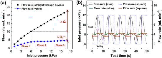 As previously mentioned, the working principle of the valve is such that flow rate across the valve is auto-regulated by the deformations of the membrane. To investigate the flow characteristics of the valve, we measured the flow rates of the prototype valve at different inlet liquid pressures, and the corresponding effects of varied pressures on the flow rates were analyzed accordingly. Flow tests were at first performed under statically varied pressures as shown in Figure 6a. In the experiment, the inlet liquid pressure of the valve was increased sequentially from 1 kPa to 17 kPa by 1 kPa step. The flow rate at each test pressure was measured and recorded in a minute. To quantitatively study the effect of the inlet pressure on the flow rate, we divided the flow rate curve into three phases based on the flow performances induced by the inlet pressures. In the first phase, the flow rate was in direct proportionality to the inlet pressure, and it increased steadily as the pressure increased from 1 kPa to 6 kPa. When the pressure was higher than 6 kPa, the flow rate began to show a significant nonlinear relationship with the inlet pressure. In the 6 kPa to 12 kPa pressure phase, we found that the flow rate was getting regulated, as it maintained a nearly constant value regardless of pressure change. To analyze the functionality of the valve, we calculated the mean flow rate and the flow variation across the above pressure ranges. The flow variation defined as the relative pulsation to the mean flow rate was calculated as a ratio of the bilateral tolerance of minimum to maximum flow to the overall mean flow rate. We obtained a mean flow rate of 4.03 ± 0.17 mL/min (flow variation ~4.22%) in the above pressure range. As the inlet pressure was afterwards increased from 12 kPa to 17 kPa, the flow rate started to slowly increase, and the flow rate could not be maintained constant anymore in the test phase. According to the experimental results, although the valve only regulated the constant flow rate for the inlet pressures between 6 kPa to 12 kPa, it still showed a significant flow autoregulation capability when the pressure was higher than the minimum threshold pressure of 6 kPa. In order to validate the flow regulation capability of the valve, we fabricated and tested a straight through device (membraneless), and it outputted a continuously increasing flow rate in the whole test process. In comparison to the membrane valve, the flow rate of the device at the inlet pressure of 17 kPa increased 123.5% (ΔQs in Figure 6a) against the flow rate at the pressure of 6 kPa, while the flow rate of the valve only increased by 23.7% (ΔQv in Figure 6a) in the above pressure range. Thus, we could conclude that the valve was totally self-adaptive, and its flow resistance varied in correspondence with the inlet pressure to regulate the flow rate by the autonomous deflection of the membrane, thereby realizing a constant flow rate in a passive manner.