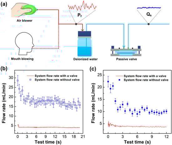 Application of the microfluidic passive valve for a stable flow in a low-cost portable gas-driven flow system. (a) Schematic diagram of the gas-driven flow system. Unstable pressure Pf was produced by an air blower and by human mouth to drive liquid in the system, and stable flow rate Qs was achieved in the system. (b) Flow rate of the system operated by an air blower. (c) Flow rate of the system operated by mouth blown air.