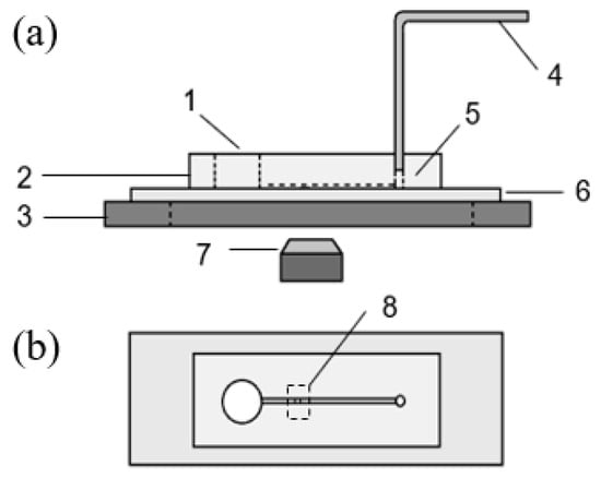 Sideview (a) and Top view (b) of the cell trapping system with a block structure: 1 medium solution reservoir(inlet); 2 polydimethylsiloxane (PDMS) microfluidic chip; 3 microscope holding stage; 4 tubing connected to syringe pump; 5 outlet; 6 substrate glass slide; 7 microscope lens and camera and 8 trapping area.