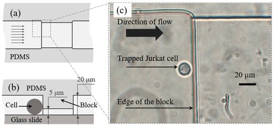 Schematic diagram showing top view (a) and side view (b) of trapping area in microfluidic channel, parallel arrows indicate the direction of the flow. A Jurkat cell was trapped by the trapping block and recorded by microscope (c).