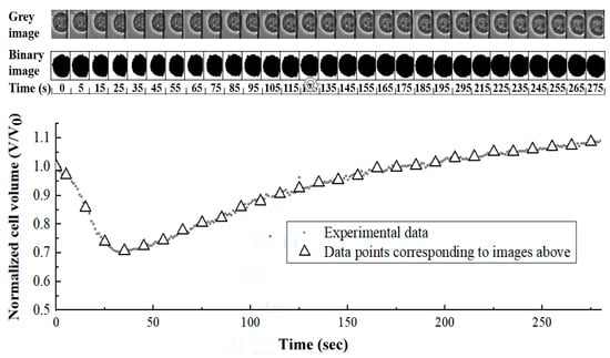 Grayscale images, binary images and quantified cell volume values of single Jurkat cell volume change after environment changed from isotonic solution to 10% (v/v) dimethyl sulfoxide (DMSO) in 1× phosphate-buffered saline (PBS).