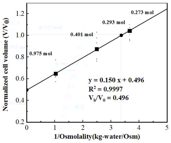 where is isotonic osmolality (Osm/kg, for blood and body fluid is approximately 0.3 Osm/kg, which is also our initial intracellular osmolality), is the isotonic cell volume (μm3), is the osmotically inactive cell volume (μm3) that could be determined by the Boyle van’t Hoff plot.