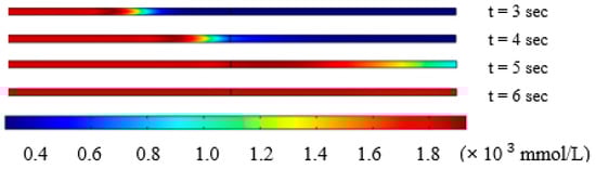 In our study, the solution in the microchannel was switched from cell suspension (297 mmol/L) to 10% DMSO (v/v) in 1× PBS solution (1823 mmol/L). As indicated in the methods section, the osmolarity distribution inside the microchannel at 3, 4, 5 and 6 s after changing solution at the inlet of the device at left side was simulated using COMSOL, as shown in Figure 5. The trapping block is located at the middle line of the microchannel in Figure 4.