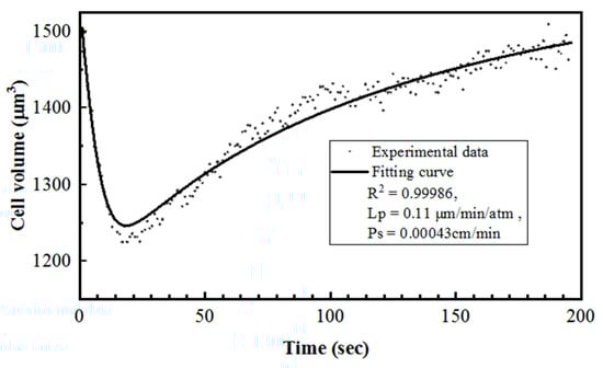 The parameter fitting result of Lp in our study was 0.14 μm·min−1·atm−1 and Ps (to DMSO) was 0.00034 cm/min in 22 °C. For reference, former results have shown Lp to be 0.38 μm·min−1·atm−1 and Ps as 0.00049 cm/min for rat basophilic leukemia cell [], Lp as 0.18 μm·min−1·atm−1 and Ps as 0.00046 cm/min for human granulocyte [], and Lp as 0.295 μm·min−1·atm−1 and Ps as 0.00098 cm/min for human vaginal mucosal macrophage []. A considerably convincing result was determined by the parameter-fitting process in this study compared with other results.