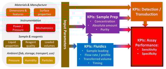 Typical (simplified) causality chain between tolerances of the input parameters for the Lab-on-a-Chip module and the performance of the target application, e.g., the quantitation of a biomarker in the loaded sample. These input parameters are set by the device materials, manufacturing, instrumentation, sample, reagents and ambient conditions, which immediately or indirectly impact Key Performance Indicators (KPIs) of flow control, sample preparation and transduction/detection to eventually determine the sensitivity and specificity of the assay.