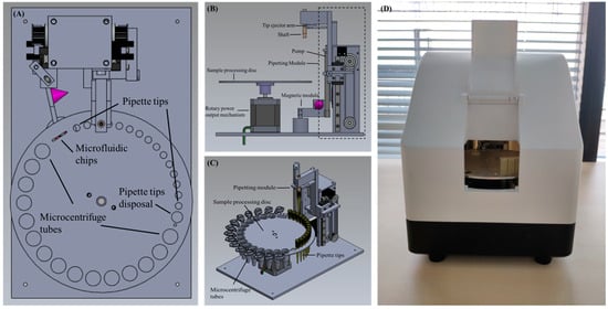 The device consists of a sample processing disc and its associated rotary power output mechanism, a pipetting module, a magnet module, and an external central controller to control the execute commands of all modules in tandem or in parallel. The schematic diagram of the device is shown in Figure 1. The sample processing disc, as shown is Figure 2A, has numerous round holes of different sizes on the outermost circumference. In particular, holes with the smallest size are for pipette tip placement, holes with the largest size are for the placement of 1.5 mL microcentrifuge tubes, and there is a medium sized hole with a circumference slightly greater than the maximum circumference of the pipette tip, which is employed for the disposal of used pipette tips and reagent waste. The rectangular hole is for placing the microfluidic chip, which is used for further PCR. The rotary power output mechanism is located underneath the sample processing disc and is connected to its center to regulate the rotating angle of the disc, as shown in Figure 2B. The pipetting module comprises of a shaft for holding pipette tips, a tip ejector arm for removal of tips, and a pump used to draw up or dispense the liquid from the disposable pipette tip. In addition, two stepping motors each connect to a slip belt (Figure 2C) are coupled to the external central controller separately to drive the shaft and the pump to move vertically relative to the horizontal plane. The magnet module includes a cone magnet (Figure 2A,B) colored in purple) to supply an external magnetic field, and a servo motor connects to the external central controller to dominate the presence and absence of the magnetic field. Furthermore, the sample processing disc, the rotary power output mechanism, the pipetting module, and the magnet module are integrated into a portable box with a dimension of 220 × 165 × 210 mm, as shown in Figure 2D, and the whole device has a weight of approximately 3 kg. Inside the portable box, a UV light controlled by the external controller is located on top to expose and decontaminate the device, therefore eliminating contamination between runs.