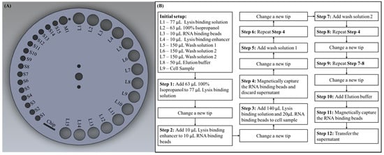 However, the process flow shown in Figure 3B is designed in accordance with the reagents and protocol we chose in our experiment. It can be easily seen that we had only occupied L1 to L9 and S1 to S8, there were still many placement holes left for use if the protocol required more reagents. Since each step of the experiment consisted of many micro steps preprogrammed in the external controller, the whole experiment process could be easily customized to meet different demands. For example, in step 3, in order to add 140 μL lysis binding solution in L1 to cell sample L9, the sample processing disc was programmed to rotate so that L1 was under the shaft, the shaft then moved vertically down until the pipette tip was merged in the reagent. Following this, the pump moved upward to aspirate the liquid into the pipette, and the shaft moved back up so that the sample processing disc could be rotated until L9 was under the shaft. Finally, the shaft moved downward and so did the pump to dispense the reagent in L9. The rotation degree of the sample processing disc, moving distance of the shaft, and the pump were all controlled by the external central controller by entering a preset value. Therefore, if the user would like to transfer reagent from L10 to L11, the user could simply program it in the external central controller. If the user only needed two washing steps, he or she can easily delete the program relating to step 9 (in Figure 3B) in the programmable controller.