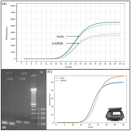 Verification of real-time polymerase chain reaction (PCR) results using total RNA extracted from 293T cells using automated miniaturized nucleic acid sample preparation device. (A) Real-time PCR amplification results on commercial real-time PCR instrument (BIOER) of Actin and GAPDH gene expression. (B) Electrophoresis gel separation and detection of Actin and GAPDH gene expression as a successful amplification result verification. (C) Comparable real-time PCR amplification results on portable microchip real-time PCR instrument using the same sample and protocol.