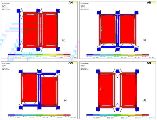 The first four order modes of the structure are analyzed and shown in Figure 2. Figure 2a shows the 1st mode (the simulation resonant frequency is 2623 Hz), the drive in-phase mode, and that the left and right masses move in the same direction along x axis; Figure 2b shows the 2nd mode (the simulation resonant frequency is 3342 Hz), the sensing in-phase mode, and that the left and right masses move in same direction along y axis; Figure 2c shows the 3rd mode (the simulation resonant frequency is 3468 Hz), sensing anti-phase mode, and the left and right masses moving in an inverse direction along the y axis; finally, Figure 2d shows the 4th mode (the simulation resonant frequency is 3484 Hz), drive anti-phase mode, and left and right masses moving in an inverse direction along the x axis.