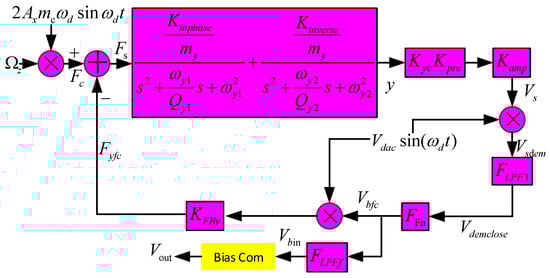 In Figure 5, it can be seen that the sense real working mode is the superposition of the sense in-phase mode and sense anti-phase mode, which has been already researched in our previous paper []. Kyc and Kpre are displaced to the capacitance transform function and pre-amplifier; Kamp is the second differential amplifier; FLPF1 is the second-order low-pass filter; FFn is the controller; KFBy is the voltage–force interface transform coefficient of the force-rebalanced combs; Kinphase and Kinverse are the displaced-voltage transform parameters of the sensing in-phase and anti-phase modes; and Kinverse ≈ 33·Kinphase, mc ≈ my. Thus, we obtain the following equations: