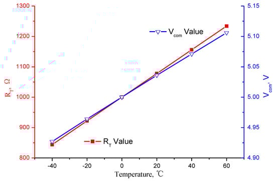 The simulation curve is shown in Figure 7, and the results show that the variation of Vcom within the temperature range from −40 °C to 60 °C is 3.633% and with a positive rate of change, which can compensate the negative rate of the gyroscope scale factor temperature coefficient.