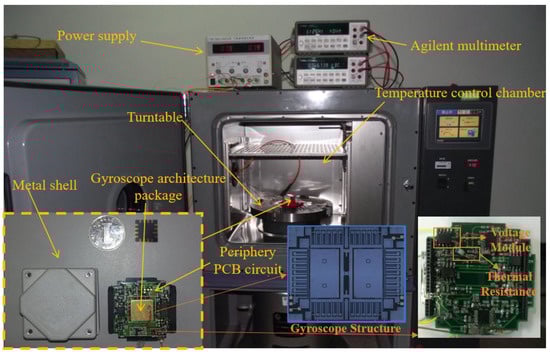 The MEMS gyroscope is fixed on the turntable in a temperature chamber, which is shown in Figure 9. The turntable is employed to calibrate the scale factor of the gyroscope, and the temperature chamber is utilized to provide different temperature environments. The power supply is used to provide +10 V, −10 V and ground voltage, and the multimeter is used to pick up the output signal of the gyroscope. Temperature variable resistors RT and RTT are employed in the “Scale Factor” and “Bias Com” modules to reduce the scale factor and temperature bias drift. Another temperature-variable resistor, Rtr, is employed to measure the real-time temperature inside the gyroscope shell, and the temperature value is picked up with the Vout value synchronously. The temperature range in this paper is set as −40 °C to 60 °C, and the scale factor is tested every 20 °C. Each temperature experiment is repeated three times to verify the repeatability of the method.