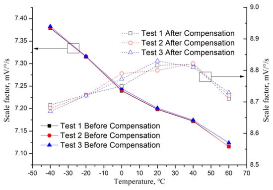 Secondly, the scale factor temperature compensation method is tested, and the result curves are shown in Figure 10; also, three repeatability experiments are finished, and the variation of the three experiments are 1.485%, 1.623% and 1.824%, respectively, with an average value of 1.577%.