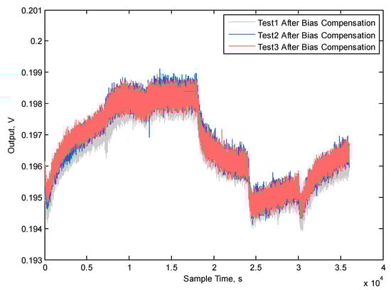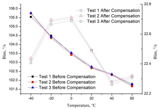 After the scale factor temperature compensation, the temperature bias experiments are conducted on the experimental platform, three repeatability tests are also done (the results are shown in Table 4), and the temperature bias coefficient values of the three tests are 0.0381 °/(s·°C) (variation 3.749%), 0.0407 °/(s·°C) (variation 4.004%) and 0.0396 °/(s·°C) (variation 3.887%), respectively. Then, the average of the temperature bias coefficient is 0.0395 °/(s·°C) (variation 3.880% with a negative rate of change), which is the aim of the compensation.