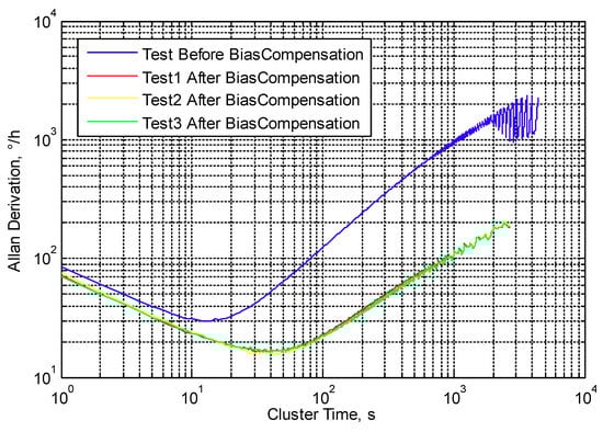Fourthly, the temperature bias compensation method is applied, and the three repeatability results are shown in Figure 11; the curves show that the repeatability of the compensation method is good. The results of bias before and after temperature compensation are shown in Figure 12. The variation of the three bias temperature compensation experiments are 1.914%, 1.868% and 1.912%, respectively, and the average value is 1.913%. The Allan derivation curves before and after temperature variation are shown in Figure 13, and the full-temperature bias stability (BS) and angular rate walking (ARW) parameters also improved from 29.52 °/h to 19.59 °/h and from 1.43 °/h/√Hz to 1.20 °/h/√Hz, respectively. Table 6 shows MEMS gyroscope temperature compensation test result.