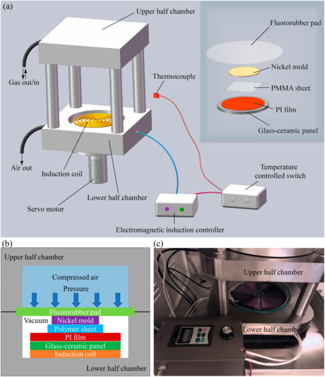 The upper half of the chamber is fixed on the stage and the lower half can be raised and lowered by a servo motor. A customer-made induction coil panel is placed in a flat groove at the bottom of the lower half chamber, generating alternating magnetic fields under the control of an electromagnetic induction controller. The electromagnetic induction controller is connected to a temperature-controlled switch, which contains a thermocouple to detect the system’s temperature. When the temperature reaches the expected value, the induction coil’s power will be cut off. Furthermore, it is capable of maintaining the system’s temperature at the expected value through quickly switching off the power supply. On the induction coil, a flat glass–ceramic panel is introduced to isolate the upper materials from the current in the coil when running, while not shielding the nickel mold from the alternating magnetic field. Heat of the upper materials is also prevented from transferring to the induction coil by the glass–ceramic panel. In order to avoid the patterns on the surface of glass–ceramic panel being imprinted onto the surface of polymer sheet, a smooth polyimide (PI) film is pre-placed on the glass–ceramic panel. A nickel mold is then placed on the polymer sheet. Finally, a flexible fluororubber pad is covered on the top of the imprint materials stack.