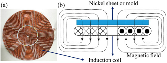 Figure 2. (a) Photograph of the customer-made induction coil panel; and (b) schematic illustration of induction heating for nickel mold.
