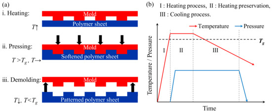 Figure 3. (a) Schematic illustrations of thermal nanoimprint process on polymer sheet; and (b) sequence of heating and pressing during the thermal nanoimprint process.