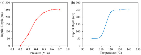 Figure 4. (a) Plot of the depth of imprinted poly(methyl methacrylate) (PMMA) nanoholes vs imprint pressure under the imprint temperature of 120 °C; and (b) plot of the depth of imprinted PMMA nanoholes vs imprint temperature under the imprint pressure of 0.5 MPa. The height of nanopillars on the mold is 250 nm.