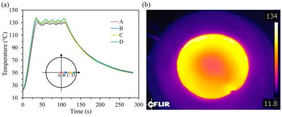 The uniformity of heating was also investigated. For the four locations A, B, C, and D, the temperature turned out to be 127.0 °C, 133.0 °C, 135.7 °C, and 137.7 °C at the end of the heating process. A temperature deviation of 8.0% was calculated between the center and edge of the mold during the heating process. This temperature difference is caused by the skin effect. Due to the skin effect, the eddy current density is largest near the edge of the nickel mold and decreases to the center. The amount of heat generated by induction heat is in proportion to the eddy current density. Thus, the temperature of edge position will be higher than that of center position. In order to show the temperature uniformity more intuitively, we used an infrared camera (T1050SC, FLIR Systems, Inc., Wilsonville, OR, USA) to record the temperature profile of the nickel mold. Figure 5b shows the infrared (IR) thermal image of the nickel mold at one moment in the heating process, which could directly show the temperature uniformity in the heating process. During the 1 minute’s time of heat preservation, the average temperature was calculated to be 127.9 °C, 128.5 °C, 130.5 °C, and 132.6 °C for the four locations A, B, C, and D. The temperature deviation reduced to 3.6% during the heating preservation. It could be explained by the heat conduction since nickel is a good conductor of heat. The temperature fluctuation during the heat preservation was caused by the temperature-controlled switch. When the temperature reached the upper limit, the power of induction coil would be temporarily cut off to terminate heating. When the temperature was down to the lower limit, the power would be turned on to restart heating. If a switch with higher frequency was used, the temperature fluctuation could be reduced further. Both the calculation of temperature deviation and the IR thermal image showed that heating was relatively uniform during the imprint process. All these results indicated that a rapid and relatively uniform heating process was gained through our apparatus in the typical imprint cycle.