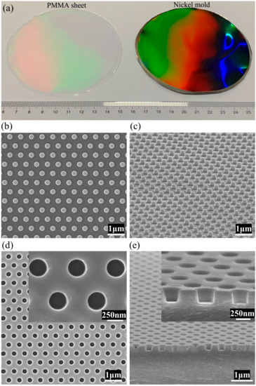 Figure 6. (a) Photograph of the 4-inch diameter nickel mold (right) and nanopatterned PMMA sheet fabricated through our rapid imprint apparatus (left); (b) top-viewed scanning electron microscope (SEM) image of the nickel mold; (c) tilted-viewed SEM image of the nickel mold; (d) top-viewed SEM images of the imprinted PMMA sheet; and (e) tilted-viewed SEM images of the imprinted PMMA sheet’s cross section.