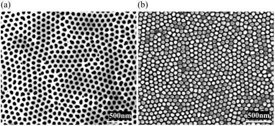 Figure 7. (a) Top-viewed SEM image of the anodic aluminum oxide (AAO) mold; and (b) top-viewed SEM image of the imprinted PMMA layer on polyethylene terephthalate (PET) substrate.